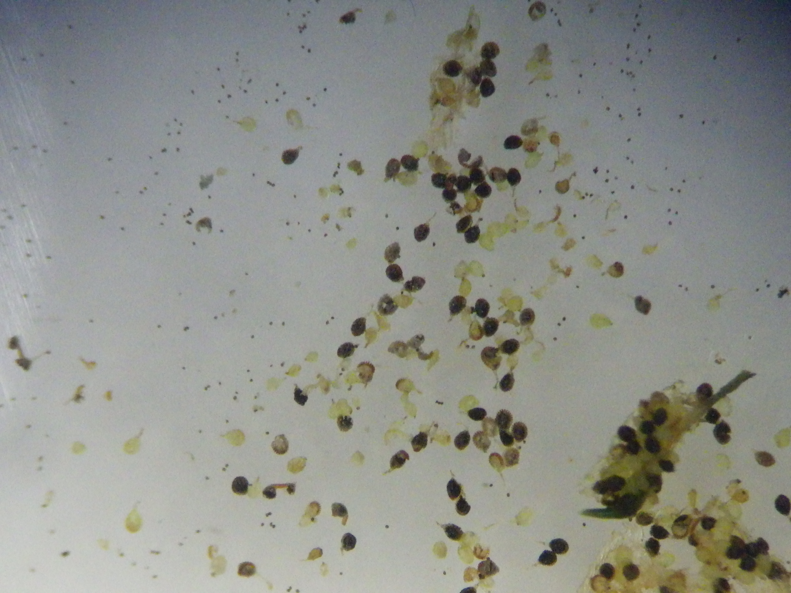 この胞子のうをスライドガラスにのせ、双眼実体顕微鏡で観察します。スライドガラスにエタノールを落とすと胞子のうから胞子が放出されるのですが、その光景がなんか阿鼻叫喚です。