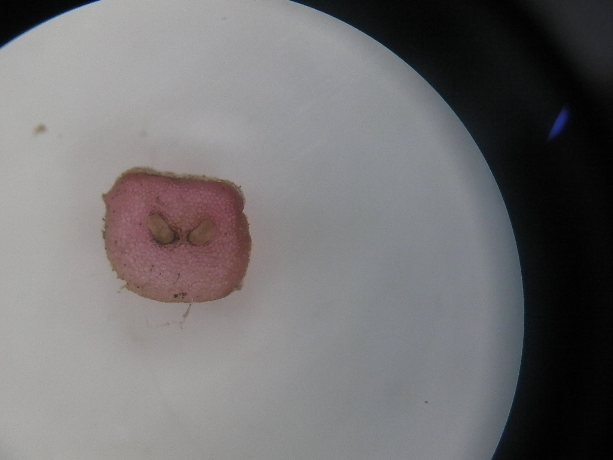 葉の柄を横に切って、断面を観察すると、維管束が見えます。維管束は水や養分などの通り道です。根で土から吸収した水を茎を通して葉で放出(蒸散といいます)できるように、維管束といういわば「水道管」が体内にあるのです。 豚の鼻みたい。