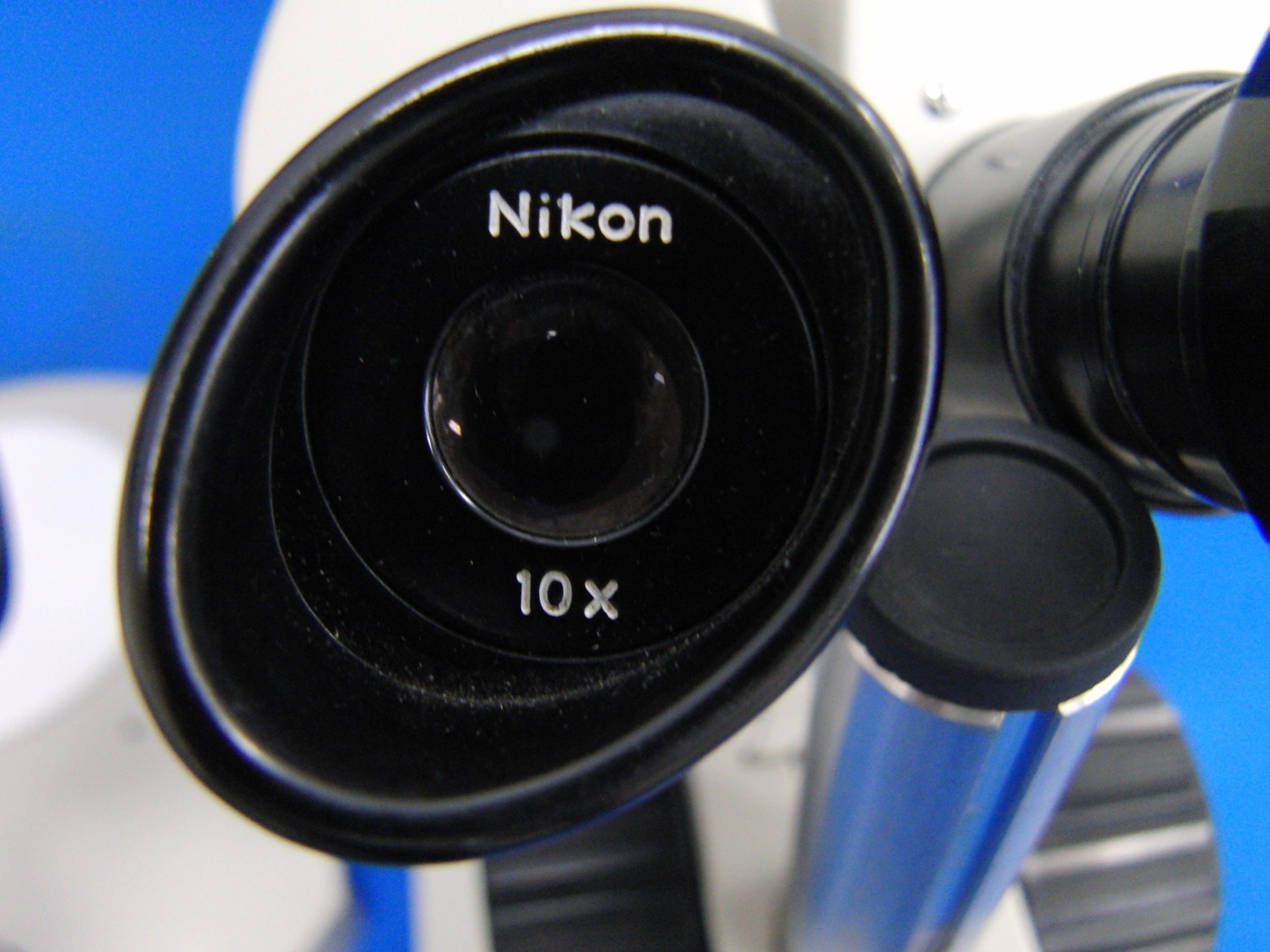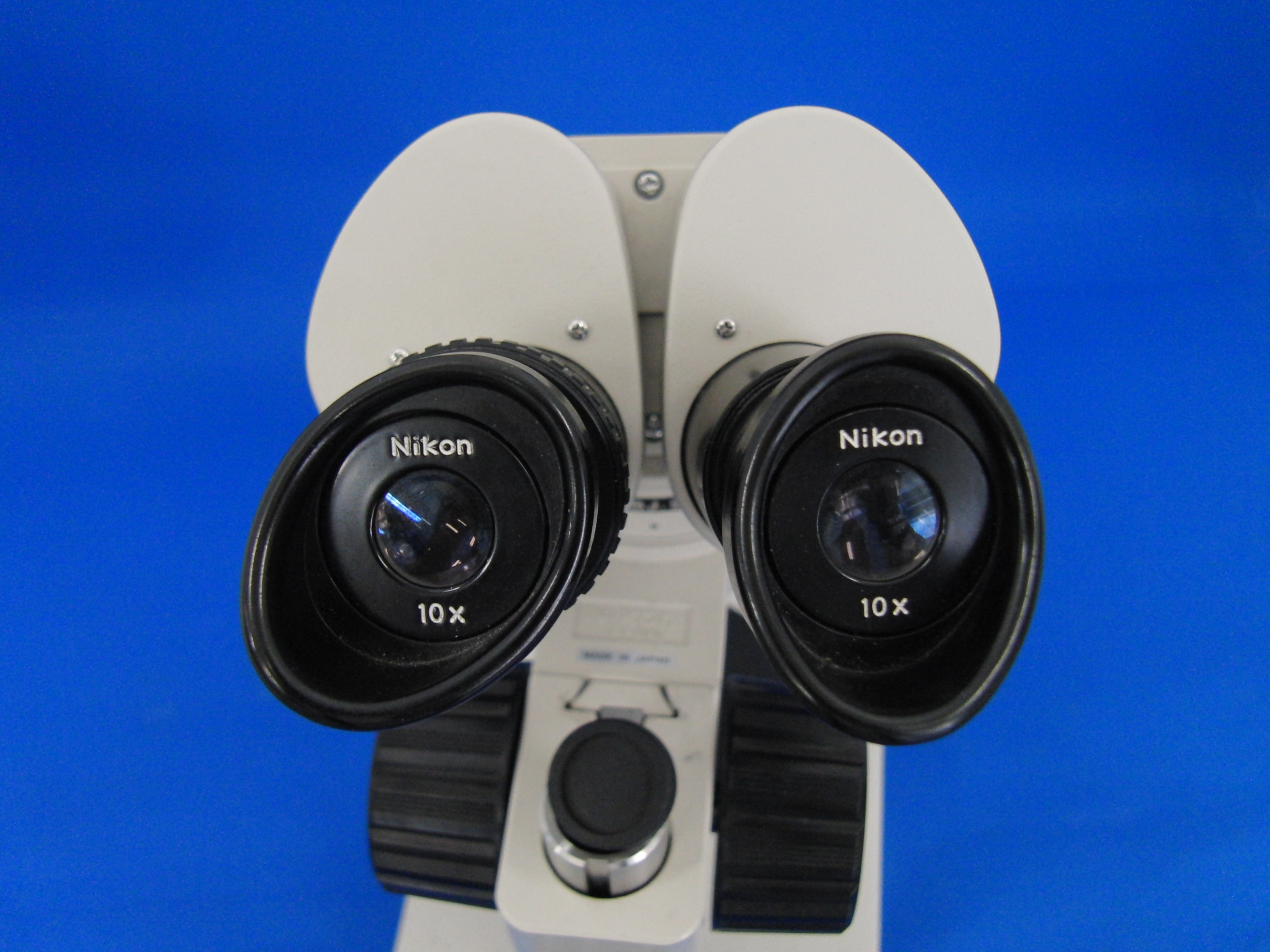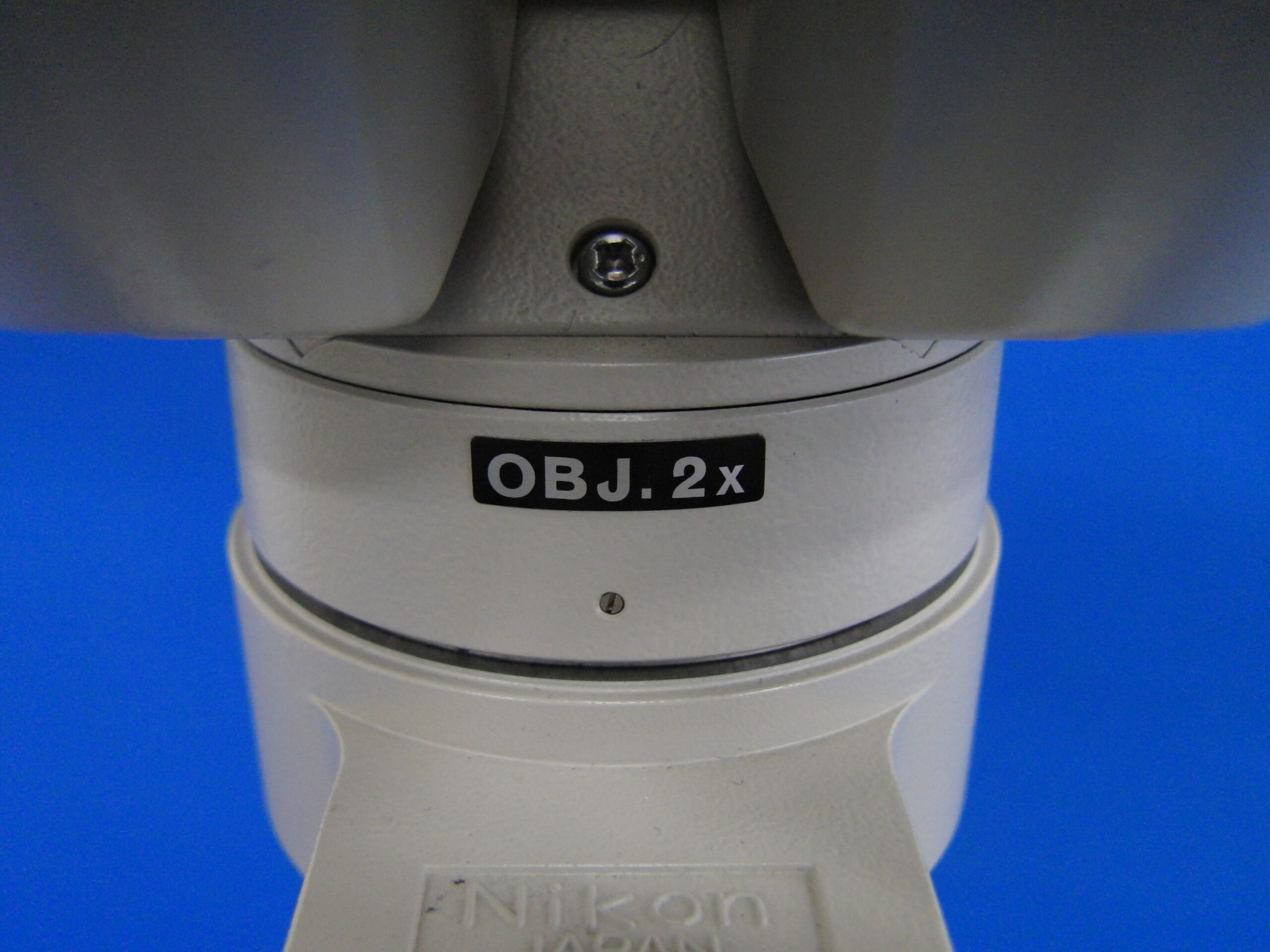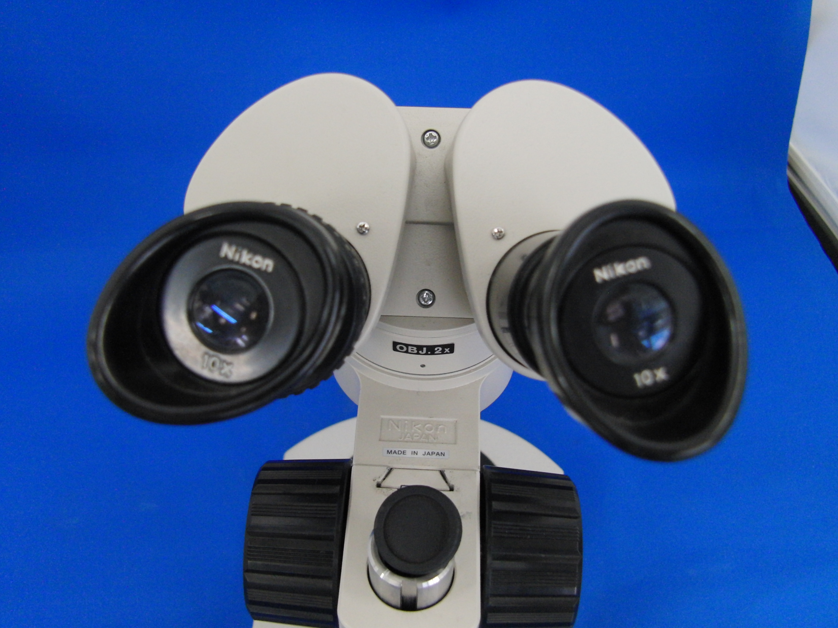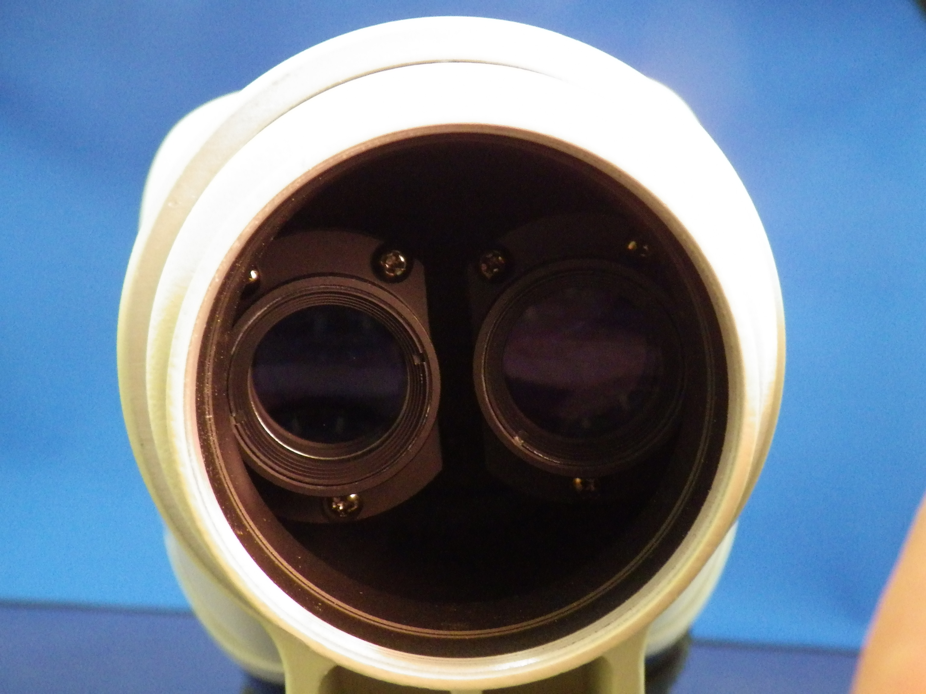 対物レンズを下からのぞいてみました。当たり前ですが、左右2つ並んでいます。