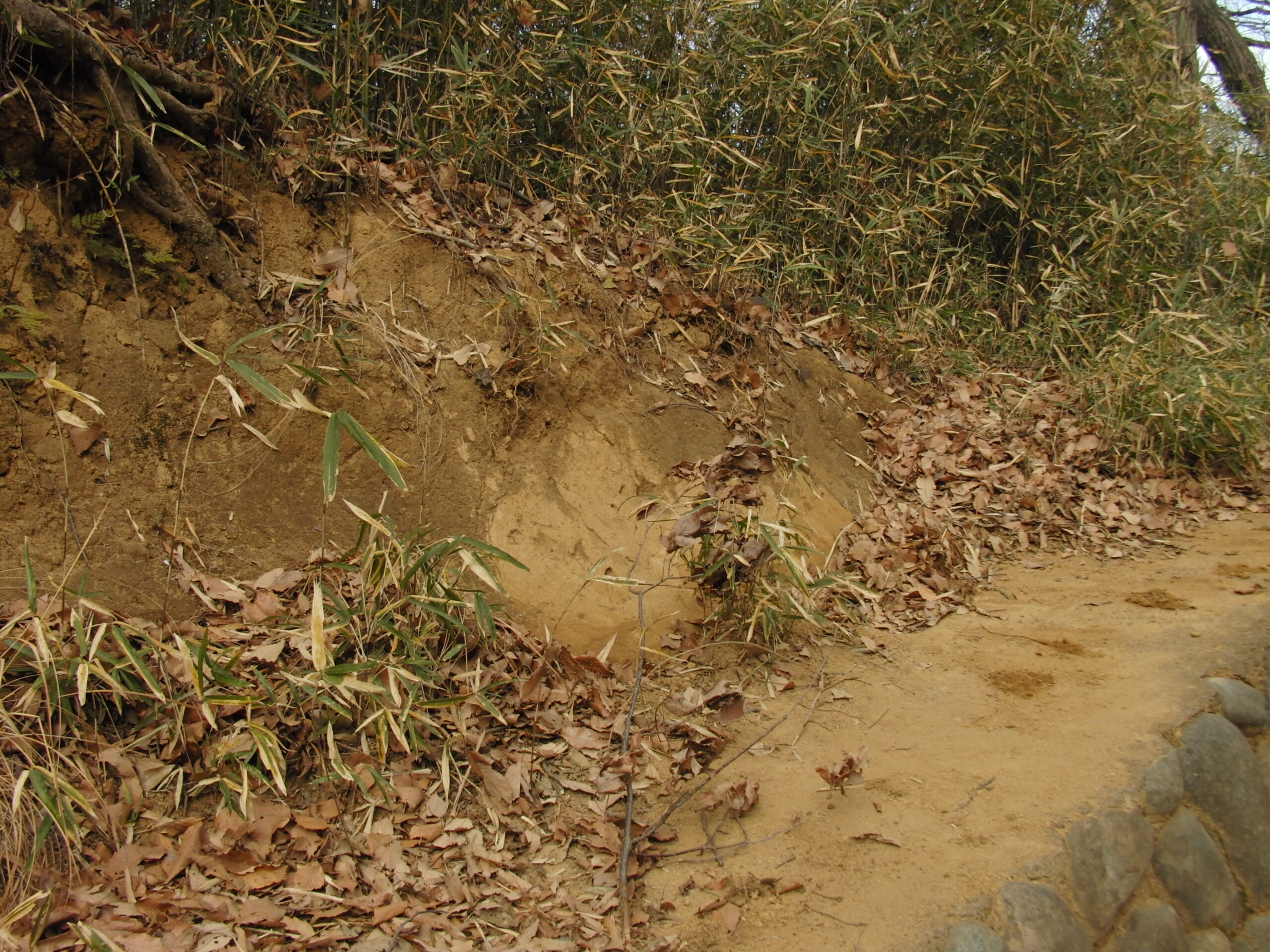 上から黒っぽい層があり、次に薄茶の柔らかい層(おし沼砂礫層)があり、下は白っぽい硬い層(飯室層)があります。