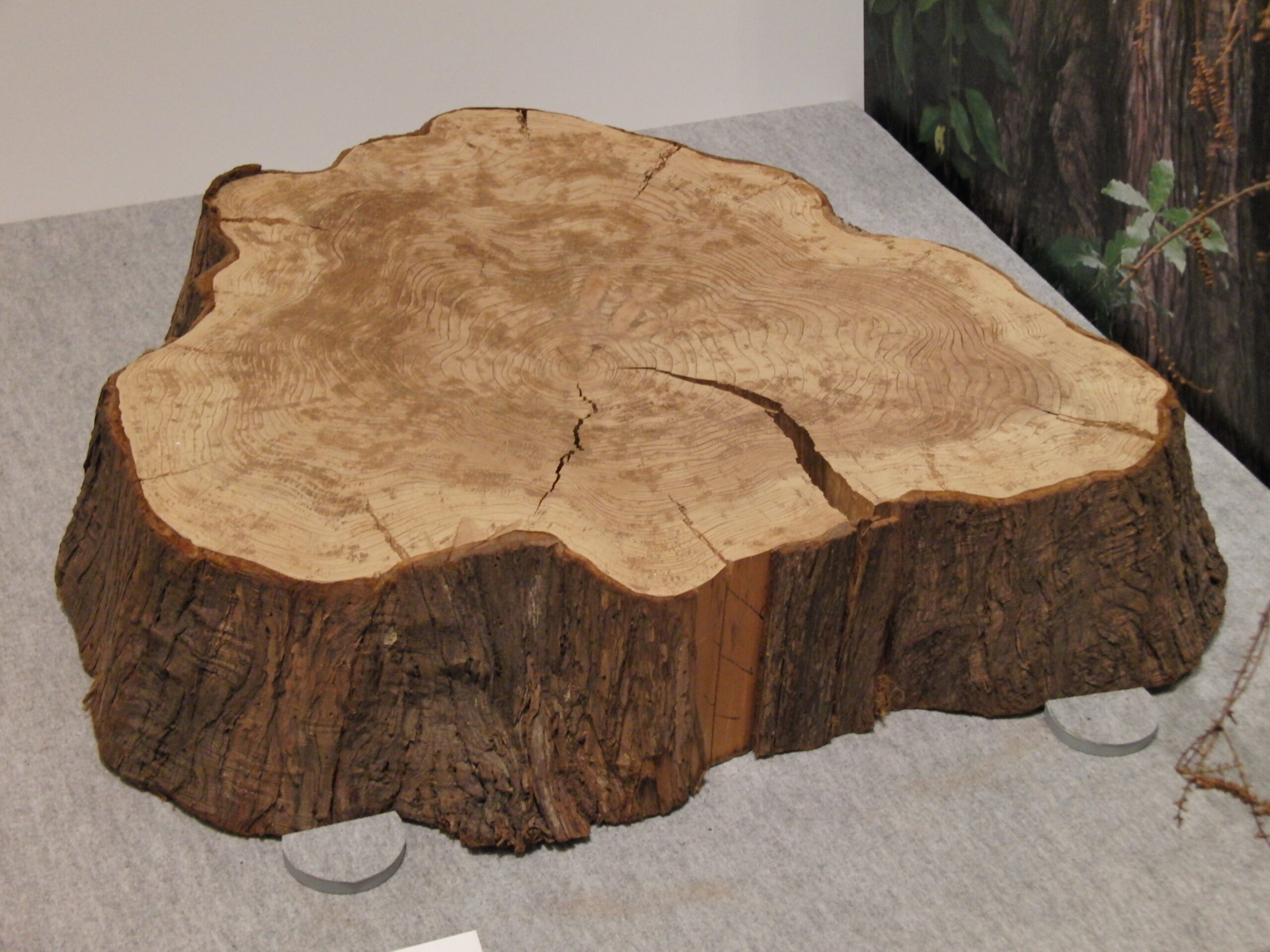 旧京都大学化学研究所に植栽された初期導入樹2世。年輪の幅が広く、成長が早かったことが分かる。