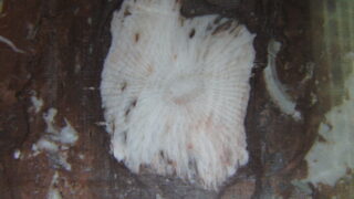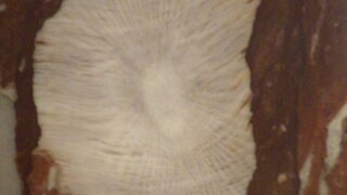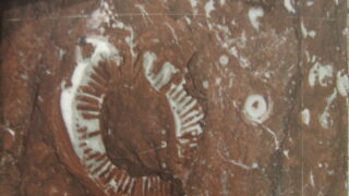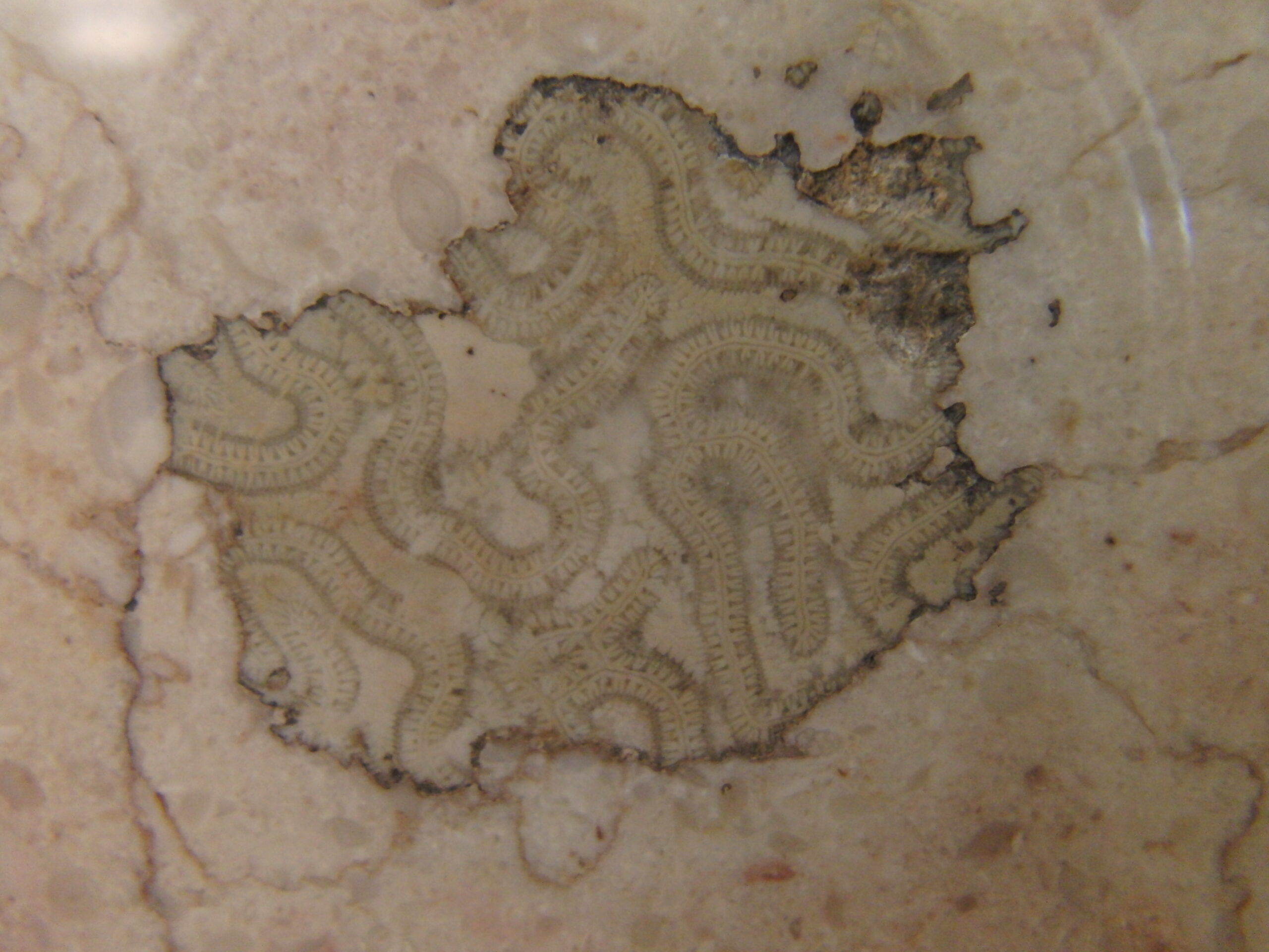 大手町ビル1階北側正面玄関からはいって左側の4本の柱を見ていきましょう。1本目の柱からサンゴを。2本目の柱 3本目の柱が面白い。サンゴでしょ層孔虫 四射サンゴ on サンゴ 4本目の柱