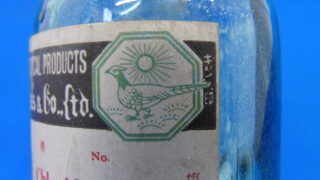 有限会社宮崎商店(現・宮崎化学薬品株式会社)は宝船のマークです。硫酸亜鉛 からにしました。硫酸亜鉛(宮崎商店) (1本目)青い色をした瓶ですが、古いだけにガラス瓶の製造技術も今ほど高くなかったのか、よく見るとガラスの厚みにムラがあったり、ガ...