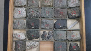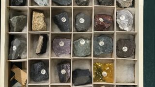 高中學校鑛物敎材 地下資源の研究 とラベルの付いた 縦12cm×横17cm の赤い紙箱。ふたの裏には鉱物名の一覧が手書きで書かれ印刷されたものが貼られています。下に東京生活科学研究所 東京都北多摩 と書かれていましたが、北多摩以降の住所は紙...