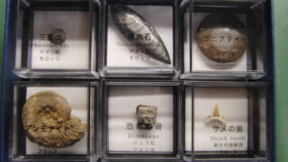 理科室の棚にひっそり展示されていた化石標本8種。国立科学博物館のミュージアムショップで1530円で売られていたものらしい。巻貝化石(軟体動物腹足類) 第三紀・鮮新世 約3万年前 イタリアサメの歯化石(軟骨魚類) 第三紀・中新世 約2000万...